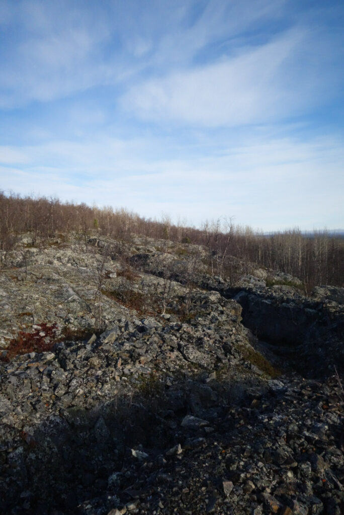 Entisöimättömät juoksuhaudat olivat ajan saatossa täyttyneet kivestä ja sammalesta siten, että kulkeminen oli helpompaa hautojen ulkopuolella. Alkuun kuljimme selkeitä polkuja, joista näki selvästi, ettemme olleet ainoat, joita entisöimätön osa kiinnosti. Koska halusimme myös poiketa ylös vaaralle katsomaan maisemia erkanimme vaarajonon laitaa jatkuvista puolustuslinjoista ja lähdimme kapuamaan ylöspäin läpi jänkkien ja matalan koivikon peittämän vaarankyljen.
