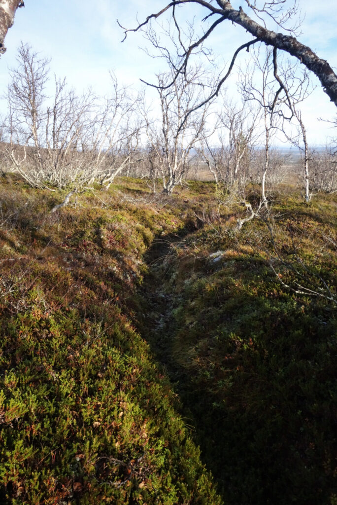 Lähdimme seuraamaan juoksuhautoja itään. Juoksuhaudat jatkuvat kartan perusteella kilometrejä Palovaaran ja viereisen Nunas-vaaran ohi käsivarren erämääalueelle. Kunnostettuja juoksuhautoja on museon ympäristössä melko pienellä alueella, mutta jos kaikki haluaa nähdä, menee jo niidenkin läpikäymisessä oma aikansa. Puhumattakaan kilometreistä ja kilometreistä entisöimättömiä hautoja.